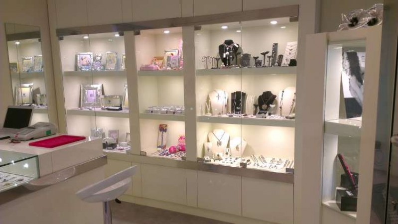 Per cessata attività cedo arredamento in legno color crema lucido in perfetto stato. Grazie al colore luminoso e all’ottima illuminazione dei faretti, risulta particolarmente adatto alla vendita di gioielli, articoli da regalo e cosmetica.