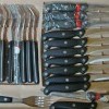 il set comprende: 12 forchette 12 coltelli 1 taglia pane 1 taglia formaggi 1 accetta per le ossa e carni intere 1 taglia carne per fettine, 1 taglia carne per carni bianche, 1 taglia pesce, 1 taglia carne per carni rosse, 1 coltello affilatissimo per filetti, 1 forbice multiuso con cavatappi, 1 forbice a cesoie con molla di ritorno, 1 forchettone per arrosti, 1 coltello affila lame