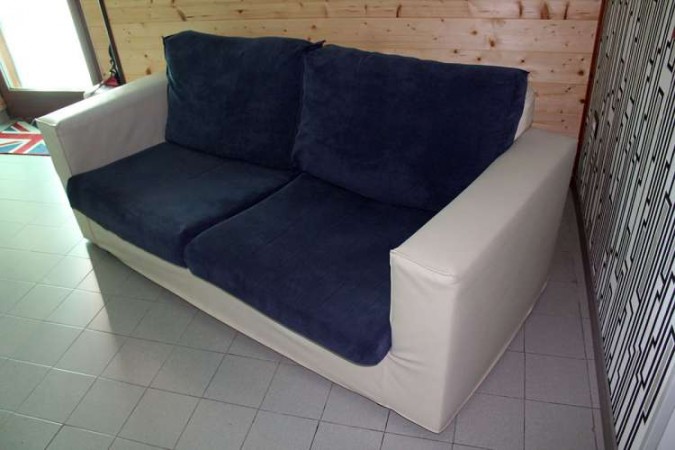 Divano 3 posti con struttura in ecopelle avana e seduta in tessuto idrorepellente e lavabile di colore blu. dim: 193x90x75cm (lxpxh). senza graffi né macchie, praticamente nuovo! consegna gratuita al piano stradale a l'aquila e dintorni. euro 200.