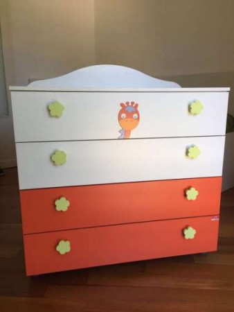 Armadietto cm 195x90x44 e cassettiera cm 90x83x46 di doimo citylinekids, bianco con pomelli verdi e cassetti arancio con decorazione giraffa, ottime condizioni.