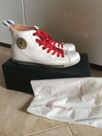 Scarpa sneakers dsquared2 num.43 bianca,compresa di sacchettino antipolvere,lacci di ricambio e scatola.vendo causa errata taglia.