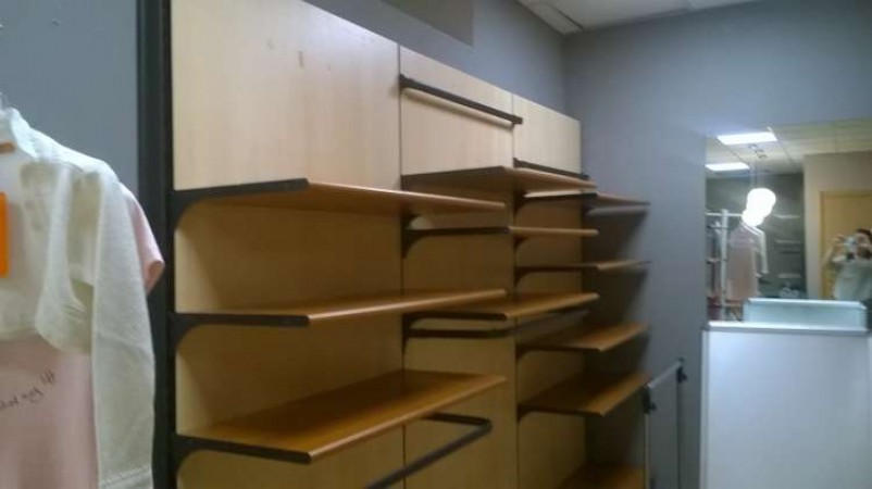 Arredamento composto da 15pannelli due dei quali specchi mensole ganci moduli due tavoli vetro un bancone vetrina con cassetti mensole accessori vari