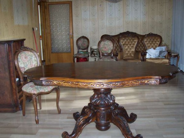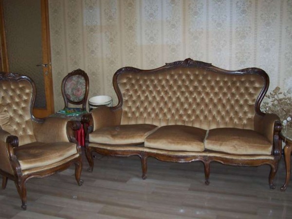 Credenza, tavolo, scaffale in radica di noce e 6 poltroncine euro 4300. divano e due poltrone stile luigi filippo in tessuto vellutato color senape euro 1.100. 2 lampadari a gocce euro 600. cassapanca in radica euro 300.