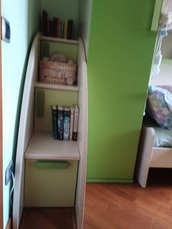 Cameretta colore verde, composta da: blocco centrale formato da 2 letti (quello superiore dotato di ribalta per favorire le operazioni di risistemazione) vari armadi, libreria, mensola, 2 cassetto sotto il letto per riporre la biancheria
